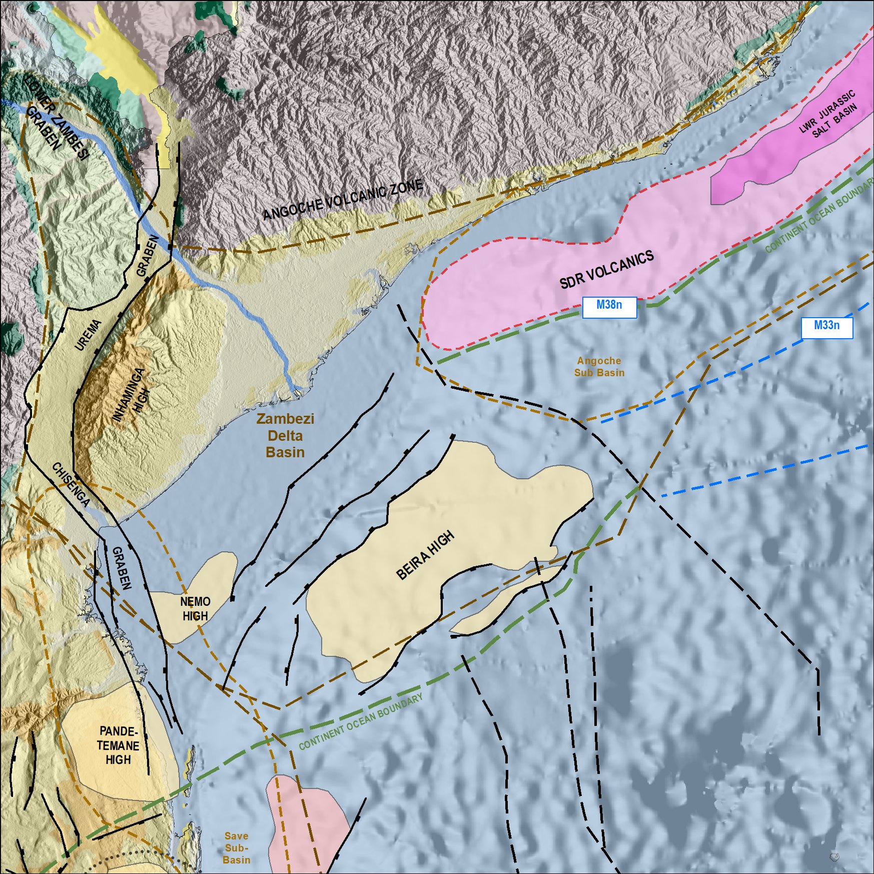The Zambezi / Beira High segment is separated from the Angoche by a NNW-SSE trending transform; probably an extension of the Prince Edward Fault Zone. Towards the shore an Upper Jurassic to Cretaceous sediment wedge, up to 9 km thick was deposited over an aborted mid Jurassic (Callovian) rift basin in the Zambezi Delta Depression. The Zambezi Delta developed from the late Cretaceous (Campanian), with up to 4 to 5 km of sediment.
